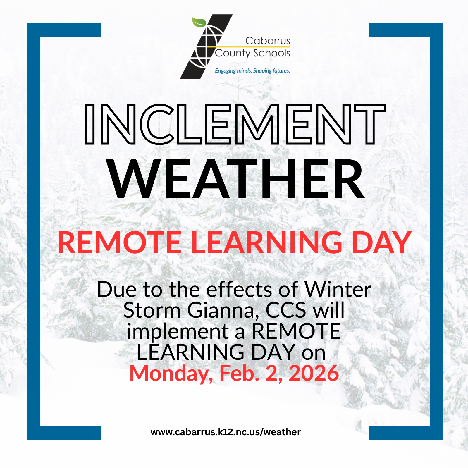 Cabarrus County Schools families and staff: All Cabarrus County Schools will be CLOSED on Monday, January 26, 2026 due to the effects of Winter Storm Fern and the potential for unsafe travel. There...
